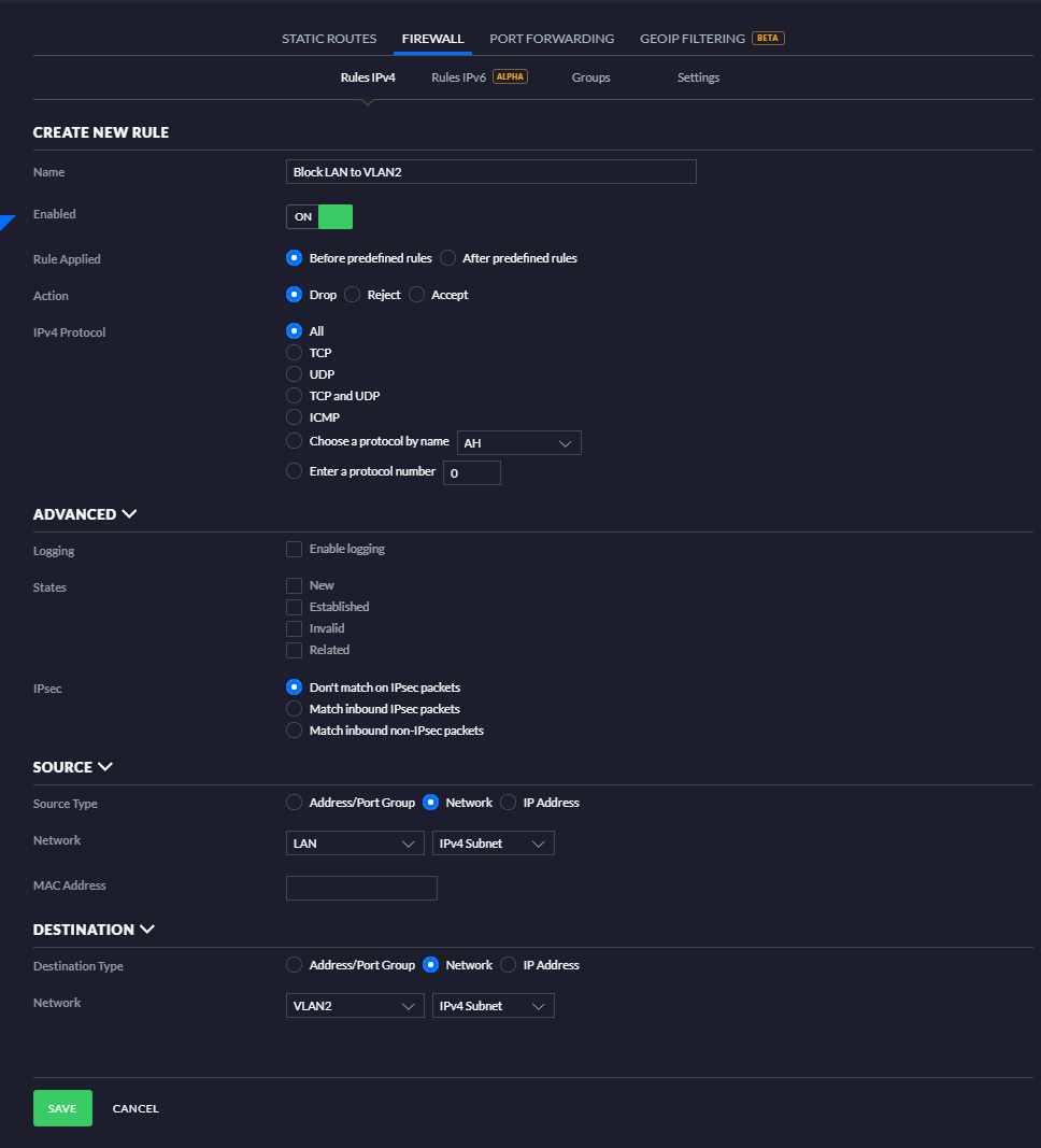 1. To disable inter-VLAN routing between LAN and VLAN2, head to the UniFi Network Controller and go to Settings > Routing & Firewall > Firewall > Rules > LAN IN1