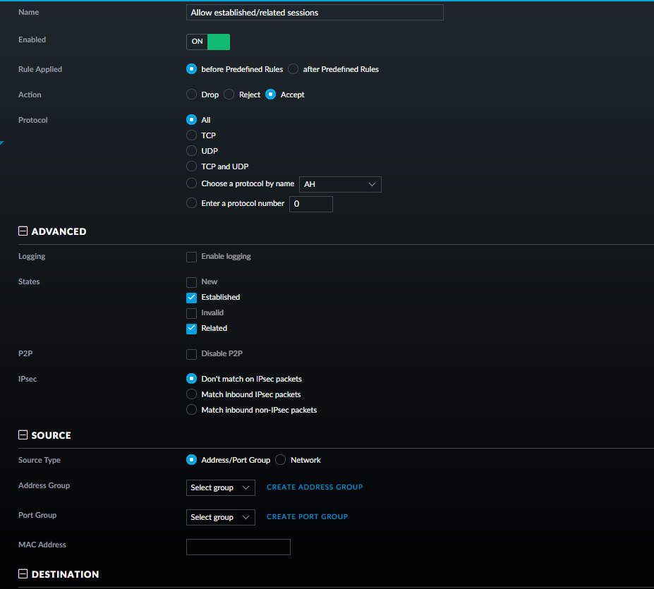 If you the objective is to block LAN to VLAN2, but allow VLAN2 to LAN, follow Option 1 first, then proceed with creating a rule at the top (first rule) of LAN_IN like the below screenshot. Adding this rule at the top of the ruleset will allow all established and related stateful firewall traffic to be able to pass, which is basically all "reply" traffic.